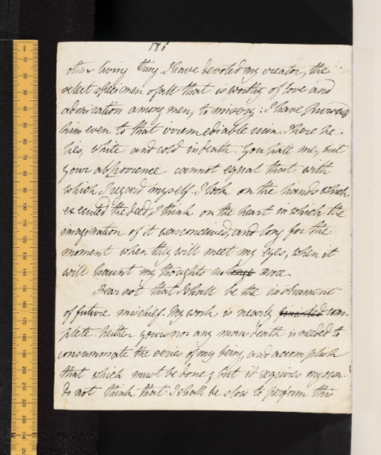 Manuscript photographs courtesy of the Shelley-Godwin Archive. This manuscript page is stored at the Bodleian Library at the University of Oxford. Preferred citation from the Shelley-Godwin Archive: Shelley, M. W. "Frankenstein, Volume III", in The Shelley-Godwin Archive, MS. Abinger c. 58, 31v. Retrieved from http://shelleygodwinarchive.org/sc/oxford/frankenstein/volume/iii/#/p62