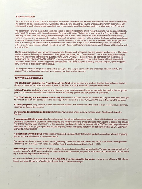 Center for Gender and Sexuality, 2002-2003; New York University Archives Collection of Publications and Ephemera; MC.334; Box 163; New York University Archives, New York University.