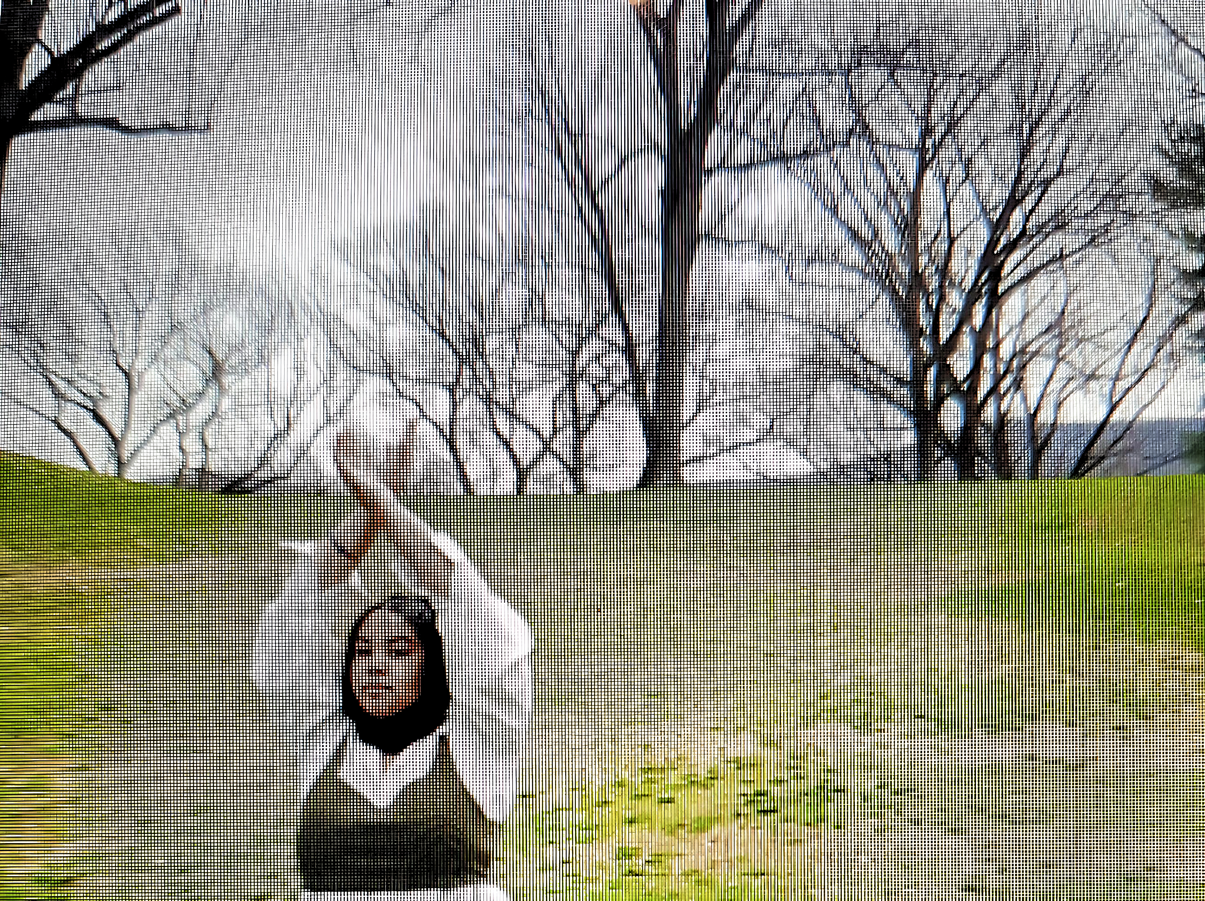 This photo expresses the ideal intimate relationship between people and nature by framing the model wearing natural colours and making an organic silhouette within the trees and grass at Storm King Art Center, an open air museum in Orange County, New York. The pixelated effect comes from my retaking the photo on my camera screen with my phone. I find the integration of pixels with nature to be unnatural yet incredibly fitting given how, today, we frequently view natural wonders from a distance through our screens. To me, the pixelated filter represents the encroachment of modern human civilization on the natural world. How does viewing landscapes through a screen alter our relationship with nature? More specifically, to what extent does this technological way of seeing inhibit our ability to connect with our natural environment?