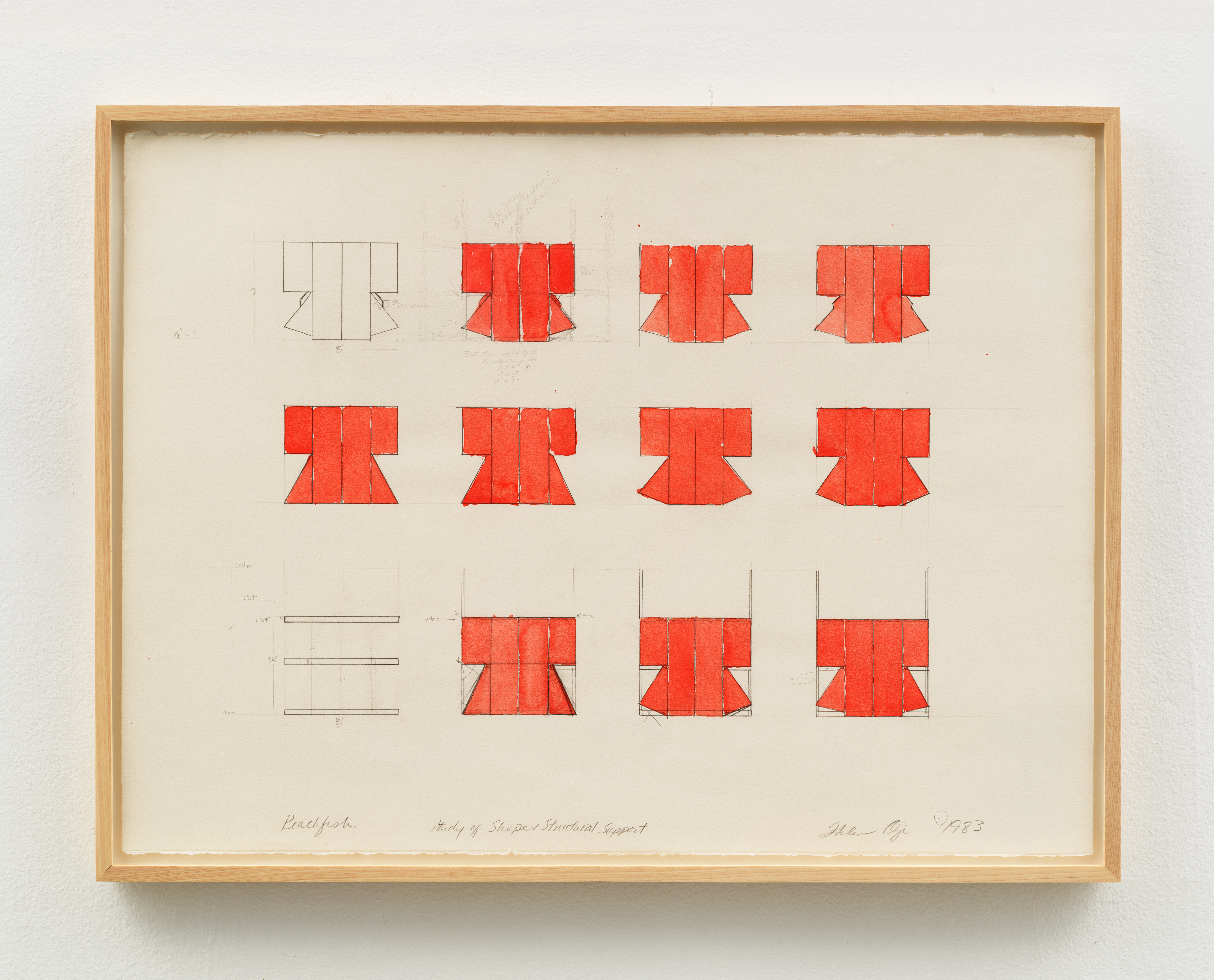 Helen Oji’s Peacefish-Set Design Study #2 draws inspiration from her Japanese heritage. The red kimono constructions acted as both prop and set, used as a landscape and sensual object. In addition to creating the set design studies and final set design for Peacefish, Oji appeared in the play performances held at the Basement Workshop.Along with her involvement with the Basement Workshop, Oji was a founding member of Godzilla: Asian American Art Network.