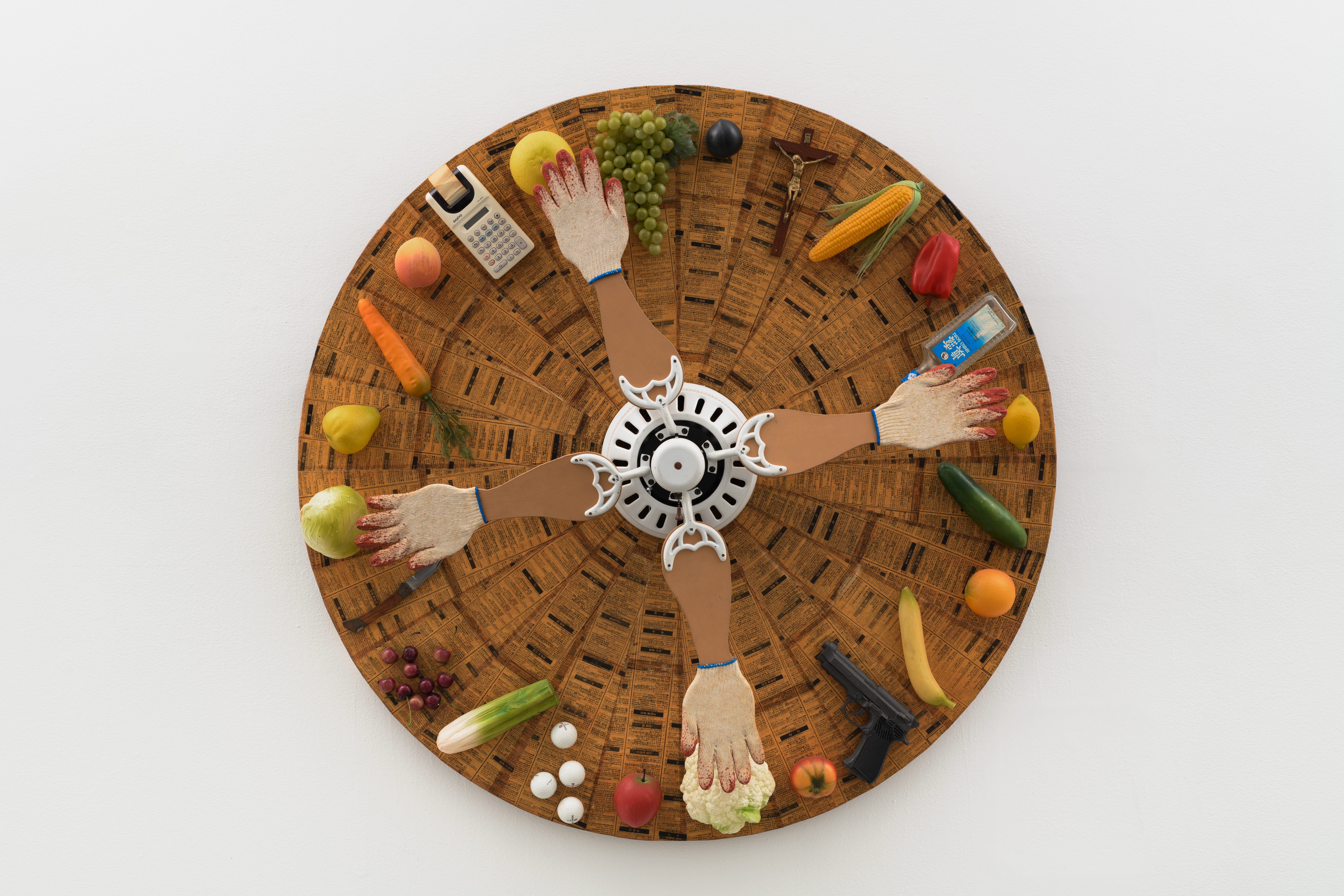 Korean Roulette features a rotating fan with blades tipped with bloody gloves that hover over a selection of vegetables and common goods found in Korean grocery stores in the U.S. The sculpture draws on Sungho Choi’s personal experiences working in similar places as a Korean immigrant living in America.