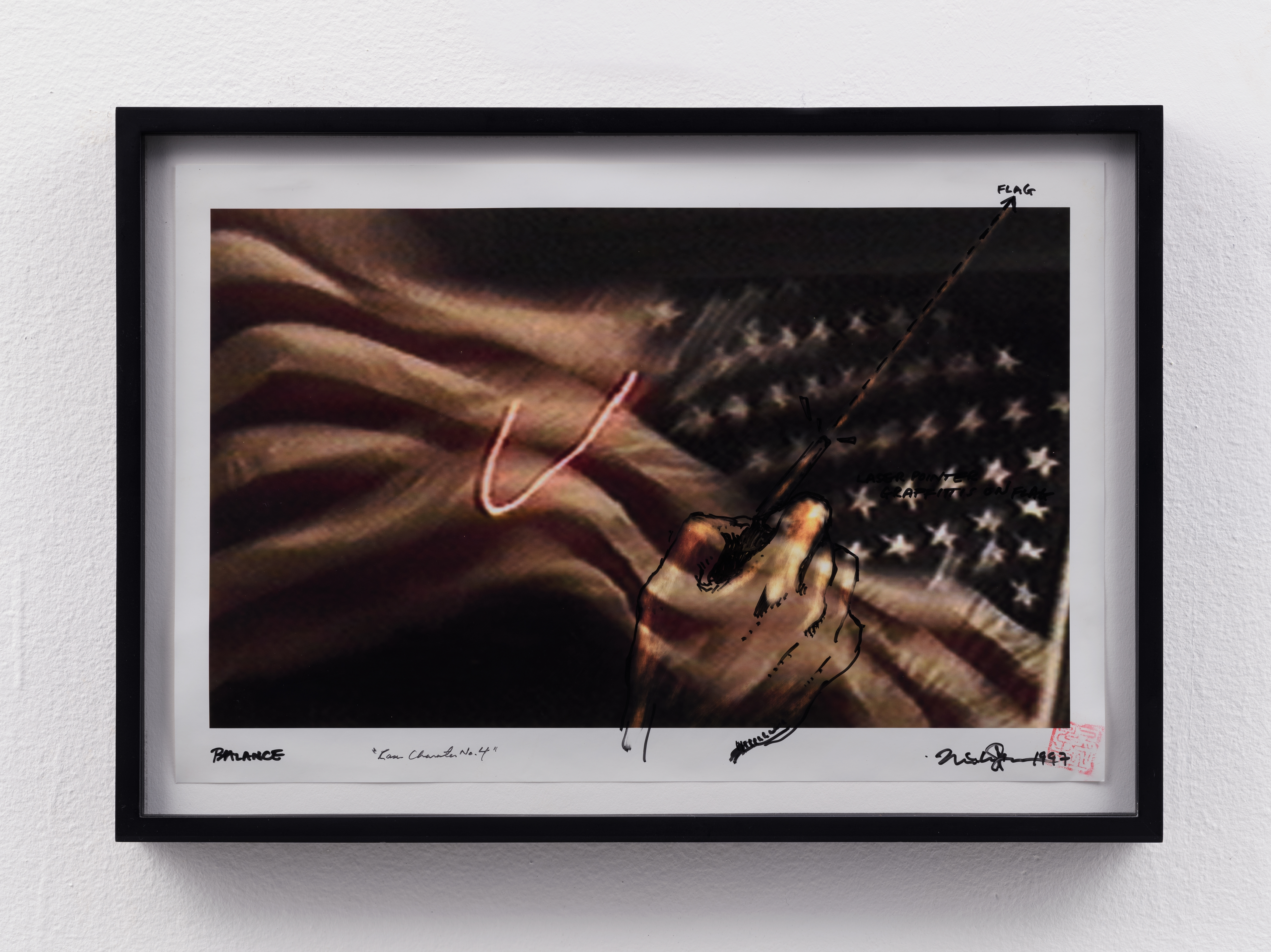 Michael Joo is an artist whose multidisciplinary practice examines concepts of perception, identity, and natural phenomenon with an emphasis on materializing the invisible.In his video work Laser Character, Joo uses a laser beam to draw characters on an American flag flown at the Custom House at the World Trade Center, all while being vigilant of security guards. The laser creates luminous trajectories that spell out the names of countries with which the U.S. has had military or commercial relations, as the artist recalls.