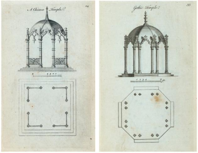 Fig. 1. Plate 24, A Chinese Temple, from Charles Over, Ornamental architecture in the Gothic, Chinese and modern taste. Engraving on paper, 14.6 x 6.9 cm. © New York Public Library Digital Collections
