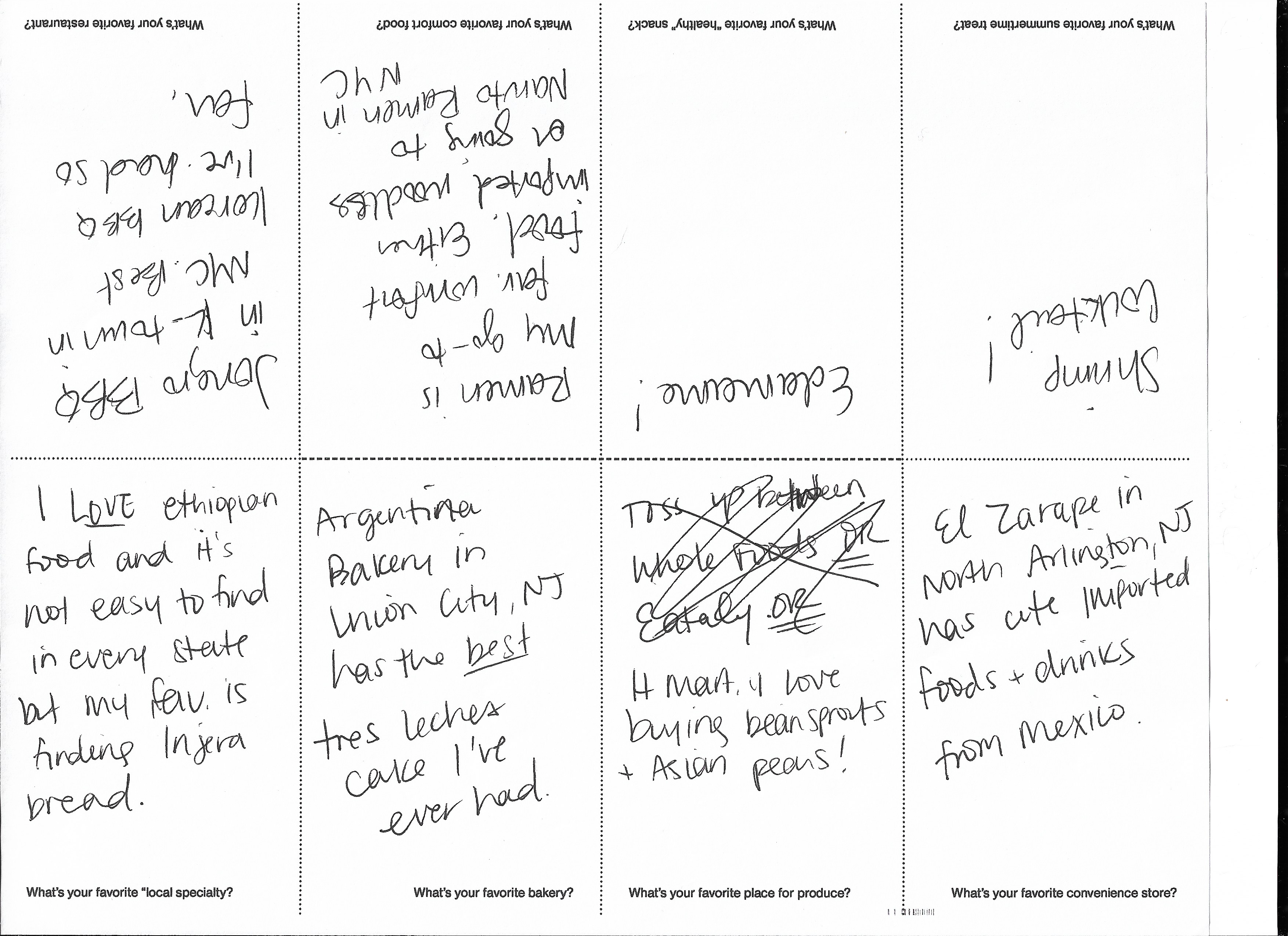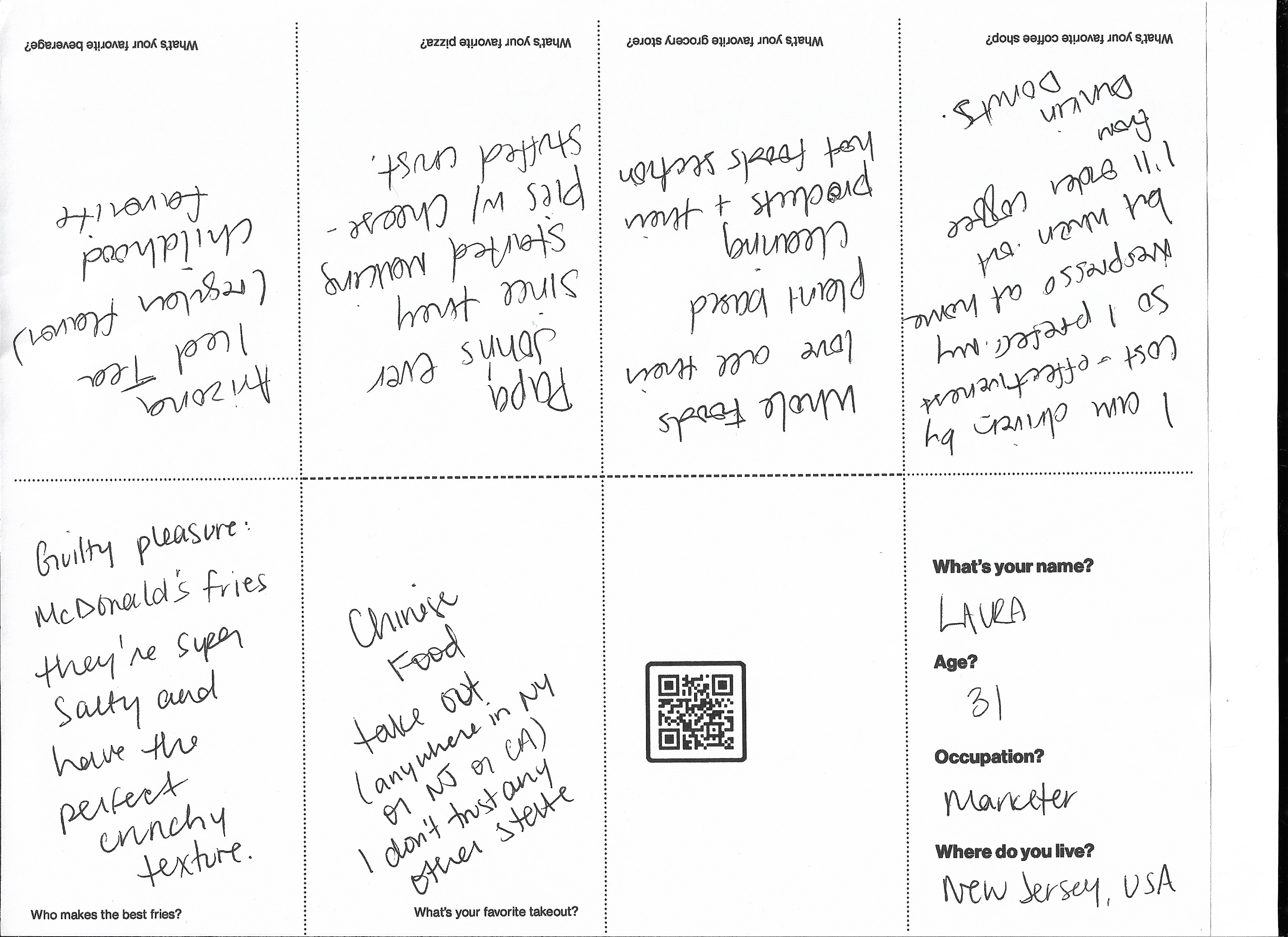 Laura submitted her entry directly to me, as we've worked together for years. I feel like I know Laura, but some of her answers surprised me. Her interpretation of a "summertime treat" was a splurge, rather than a dessert, and she chose a shrimp cocktail. I was delighted to find that we share a love of Whole Foods. Her choices vary from hidden local gems, such as an Argentinian bakery to hot McDonald's french fries.
