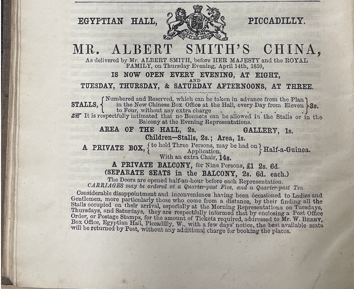 With the plainest cover design that looks like a modest notebook, and in a portable size that could be easily put in a purse, To China and Back: Being a Diary Kept, Out and Home is, unsurprising, a diary. As stated in the Preface, this “little book is really what it is called…and nothing more.” Candidly and humorously written, Smith records his journey to Hong Kong and Canton in 1858 in the tone of an old friend who keeps prattling on about his exciting trip. The content ranges from the description of a memorable Chinese meal to the copy of a program for a peepshow related to his trip that he created upon returning home (see Fig. 4).