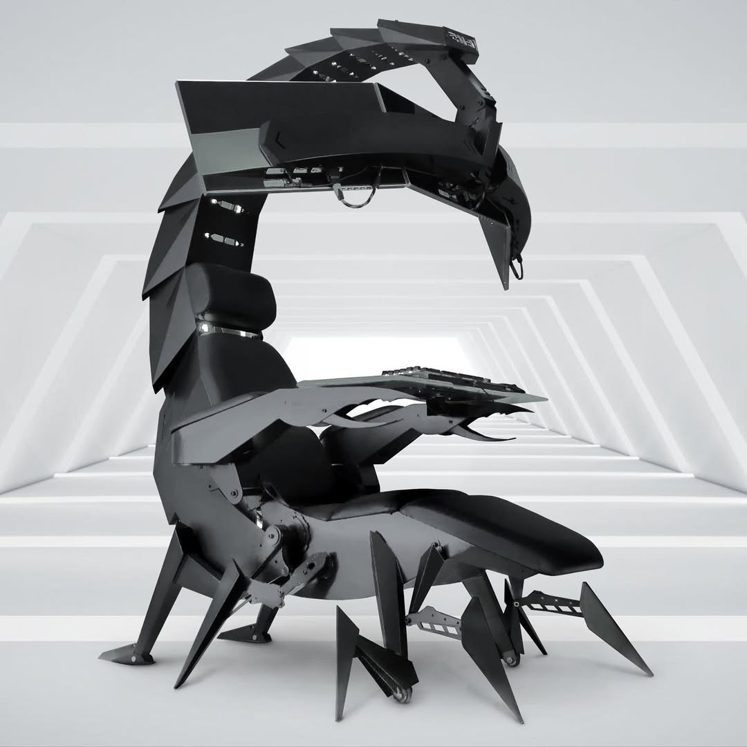 The SK Scorpion King, designed by company founder Jianze Zhou, exemplifies this approach. Inspired by the anatomy of a scorpion, the chair integrates an automated tail boom, articulated legs, and a flexible backrest within a welded high-carbon steel chassis. Composed of thousands of precision-engineered parts, the chair dramatizes the relationship between the human body and machine. Its biomimetic form draws from sci-fi aesthetics and gaming culture, invoking themes of posthuman embodiment and the merging of virtual and physical domains.